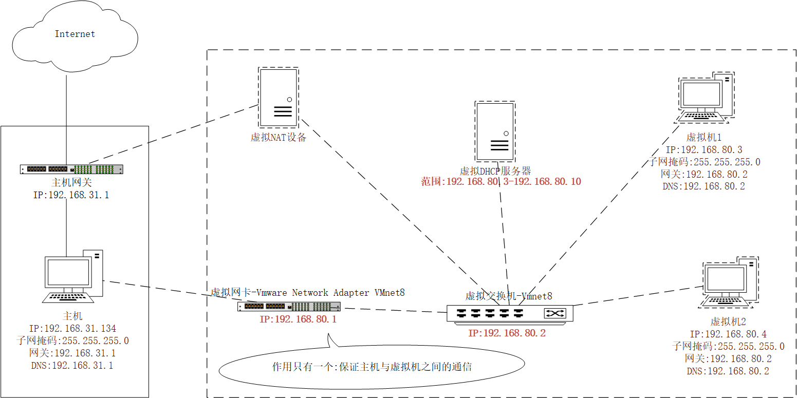 虚拟机的IP都是由虚拟交换机决定的,由虚拟NAT负责连接外网,而虚拟网卡VMware Network Adapter Vmnet8只是负责主机与虚拟机之间的通信。